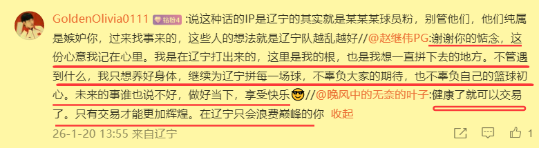 值得一提的是,对于添乱网友的不实猜测,辽篮队长赵继伟毫不客气地进行了驳斥。他说虽然以后的事谁也说不谁,但是任何时候他都绝对不会忘根、忘本,永远怀揣着一颗感恩的心,想一直为自己的母队辽篮拼下去。