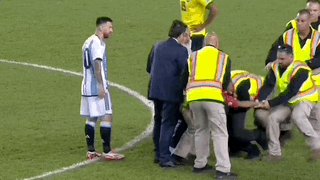 第64分钟,一名球迷冲入球场,企图与梅西合影,但在他得逞前被保安成功拦截住,并很快被押送离场,梅西显得很无奈。