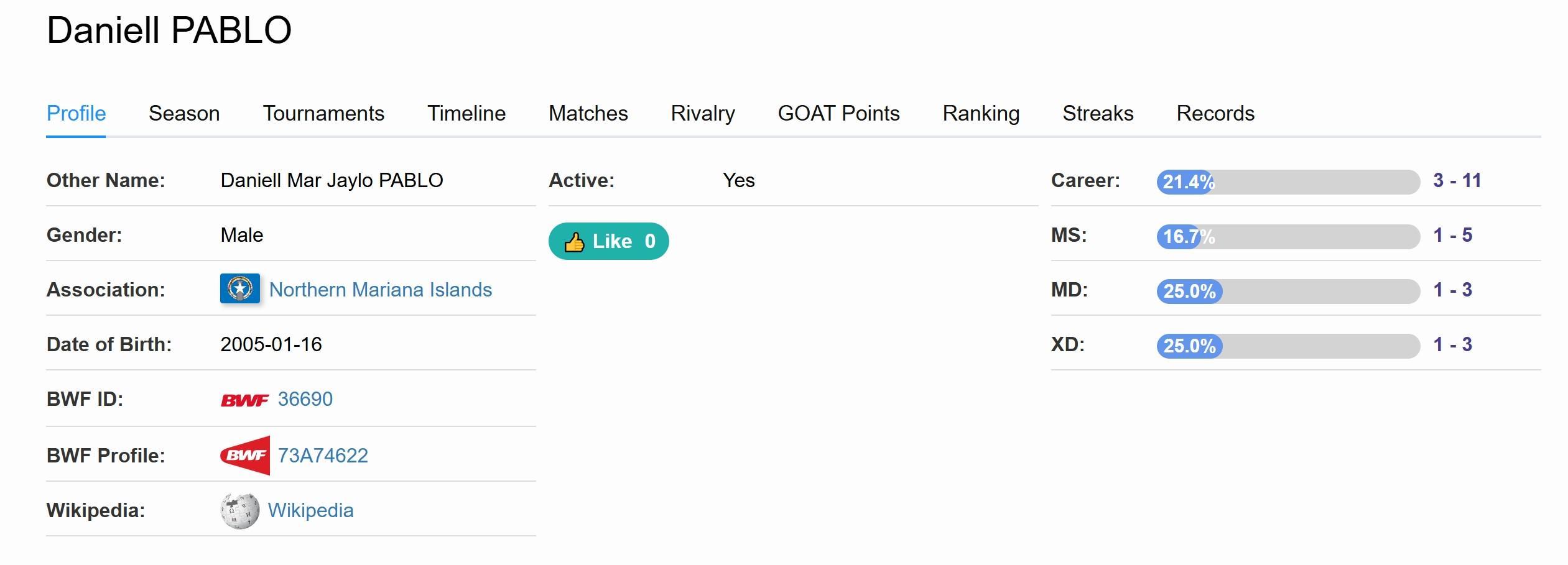 其中,上一场对阵澳大利亚U23时首发的主力中卫丹尼尔-巴勃罗平时也经常兼项打羽毛球,并且是一位在大洋洲羽协注册的运动员以及裁判员。通过国际羽联的官网可以看到,目前该球员在羽毛球赛事中的总战绩为3胜11负。